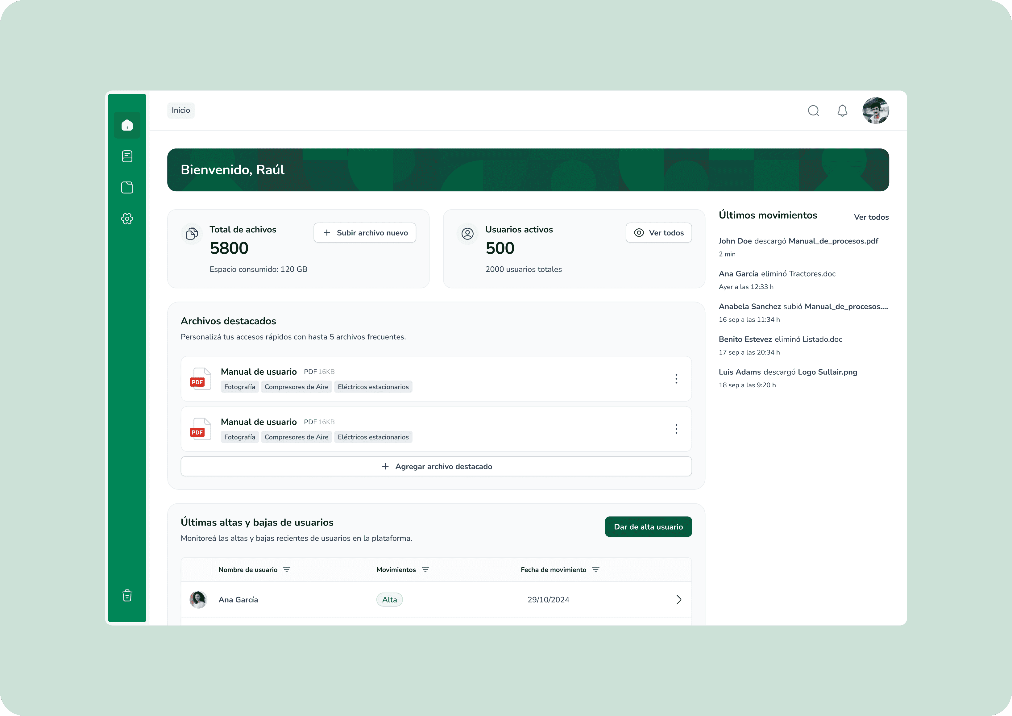Dashboard Overview of the platform’s activity, highlighting key metrics, recent actions, and quick access to frequently used files.